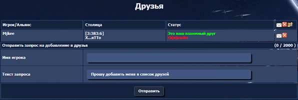 В отправке запроса на добавления в друзья вводим ник игрока, можно также изменить текст запроса, после чего нажимаем Оправить. Ваш запрос появиться у вас и у игрока, к которому вы отправили. Он можете либо принять, либо отклонить предложение.