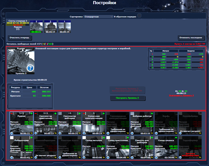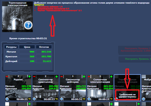 - Ниже названия Постройки, количество ресурсов необходимое для постройки здания. В эти ресурсы включены ресурсы, находящиеся на планете и летящий флот с ресурсами на данную планету. Зелёным будут выделены цифры, что ресурсов хватает, красным - не хватает, также если ресурсов хватать не будет, то изображение постройки будет затемнено остальных построек с надписью посредине "не хватает ресурсов".