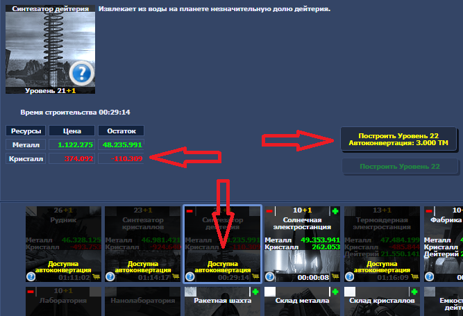 Автоконвертация доступна если для постройки/исследования не хватает какого-то конкретного типа ресурсов, однако есть излишек других ресурсов, которые можно сконвертировать на ЧР в недостающий ресурс.