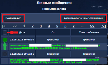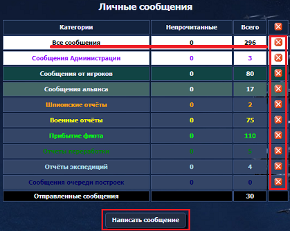 В Категории сообщений, можно удалить все сообщения в разделе. Например, если Вы нажмете справа "Красный крестик" на разделе Прибытие флота, то Вы удалите все сообщения в данном разделе (Рисунок 1).