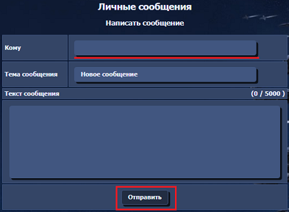 Чтоб оправить сообщение, нужно из списка категорий сообщений по ссылке "Написать сообщение" в самом низу таблицы категорий, ввести ник играка в строке "Кому" и потом нажать на кнопку "Отправить" (Рисунок 2).
