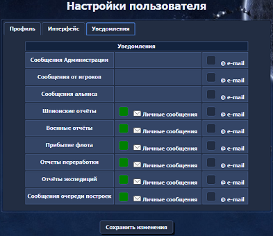 В "Настройках пользователя" можно отключить получения определенных категории сообщений. В этот список входят: Шпионские отчёты, Военные отчёты, Отчеты переработки, Прибытие флота, Отчёты экспедиций, Сообщения очереди построек (Рисунок 5).