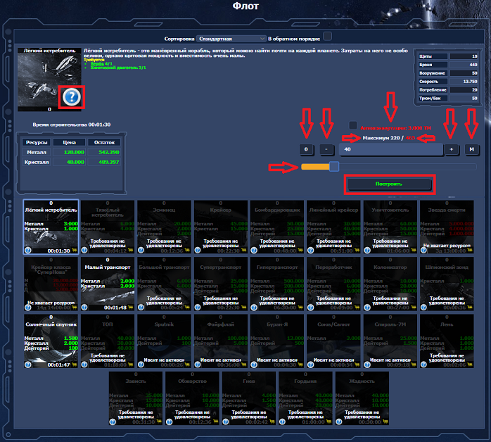 Также нужно наличие ресурсов на постройку их. При нехватке ресурсов, будет показывать на изображении корабля.