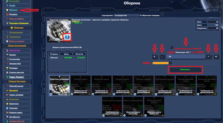 Меню "Оборона" предназначена для постройки обороны на выбранной планете или луне.