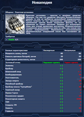- Верфь/Технологии - в зависимости от уровня вашей Верфи и ваших Технологий, будут появляться новые виды оборонительных сооружений. Чтоб узнать, что нужно для постройки оборонительного сооружения, необходимо посмотреть в описании Требования или посмотреть в Новапедии (вопросительный знак ( ? ) на изображении оборонительного сооружения).