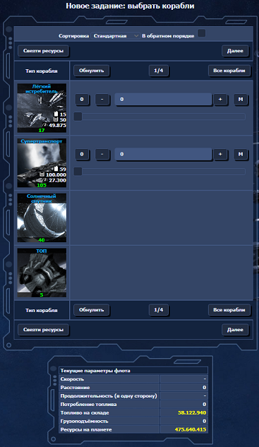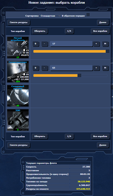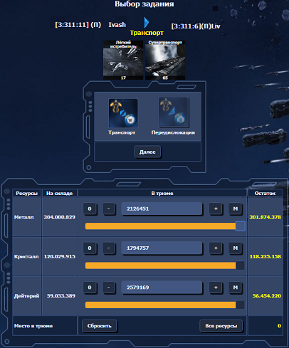 Заполняем трюмы кораблей ресурсами с планеты (металл, кристалл, дейтерий). Тремя ползунками указываем, сколько чего берем с собой, справа указывается, сколько чего останется на планете.