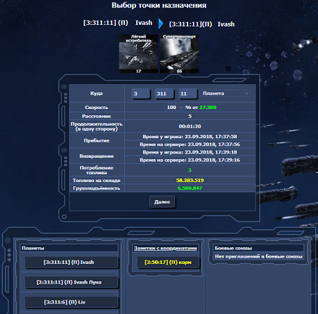Пока не будем усложнять, просто выберем одну из своих планет в списке. Видите, на рисунке теперь изменился пункт назначения, да и время полета указано вполне реальное?