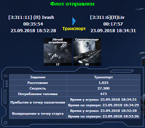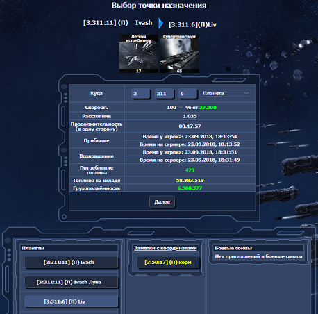 Жмем Далее - и флот отправлен по указанным координатам.