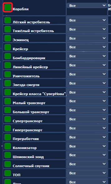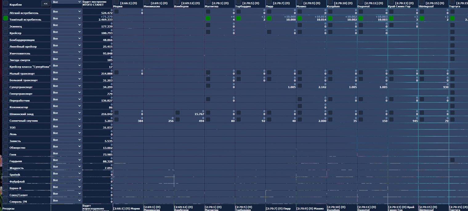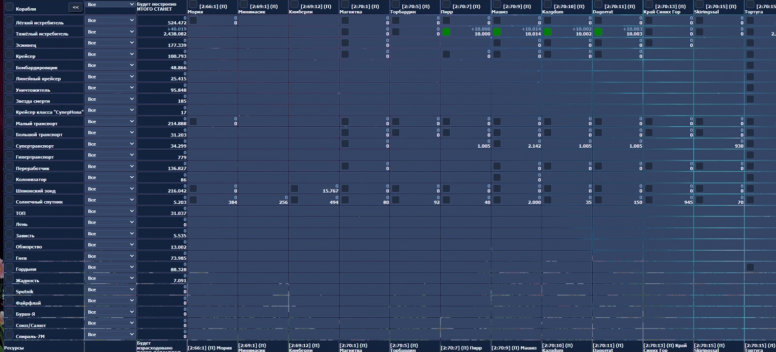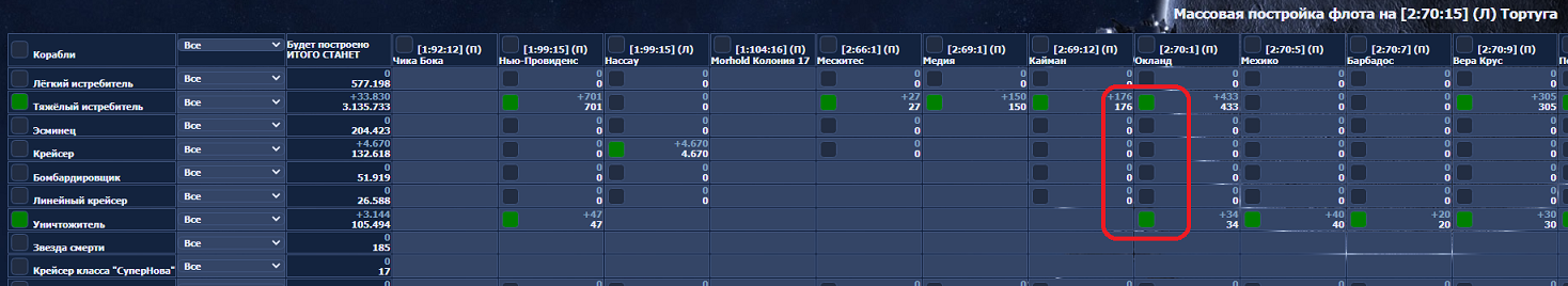 Обратите внимание, зеленые квадратики у нас расположены не под всеми планетами. Кое-где есть пропуски. Но тут все точно так же, как и при постройке вручную. Или верфи нет или уровень не подходит или ресурсов нет. Т.е. массовые операции "подхватывают" все условия по планетам и работают точно так же, как обычная ручная постройка. Только сразу по всем планетам.