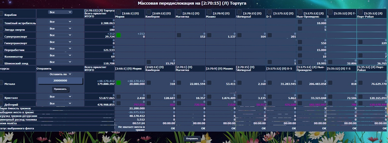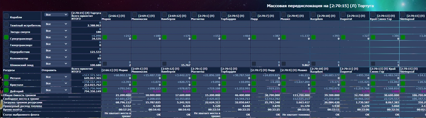 Массовая передислокация кораблей пригодится нам, когда нужно собрать корабли со всех или нескольких планет/лун на какую-то одну. Например, мы строим флот в пуле близко расположенных планет и потом все быстро свозим на одну. Очень удобно. Почему "близко расположенных"? Потому что если у вас планеты расположены за 10 галактик друг от друга, то это и долго и дорого, да и топлива может не хватить. В этом случае лучше перекидывать вратами.