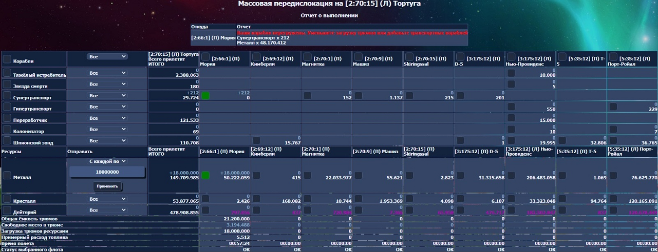 Так произошло потому, что цифру в 20000000 мы задали, но не нажали кнопку "Применить". Нажатие этой кнопки обязательно, иначе введенная в поле цифра просто не будет учтена. Вверху рис. 3 мы можем видеть результат такой отправки - флот перегружен. Надо нажать корректное значение и нажать кнопку "Применить".