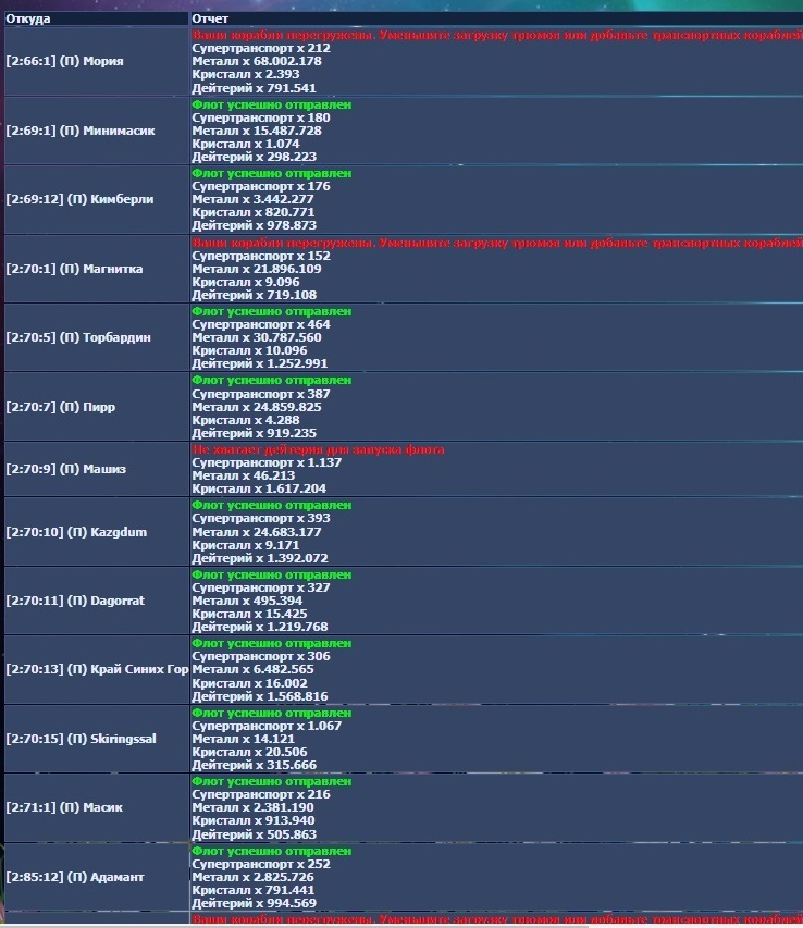Настраиваем так все флоты и отправляем. Если где-то настроили неправильно или у нас не хватает дейтерия для отправки флота - увидим сообщение об этом. На рис. 4 большая часть флотов улетела, но есть и сообщения о перегрузке или о нехватке дейтерия.