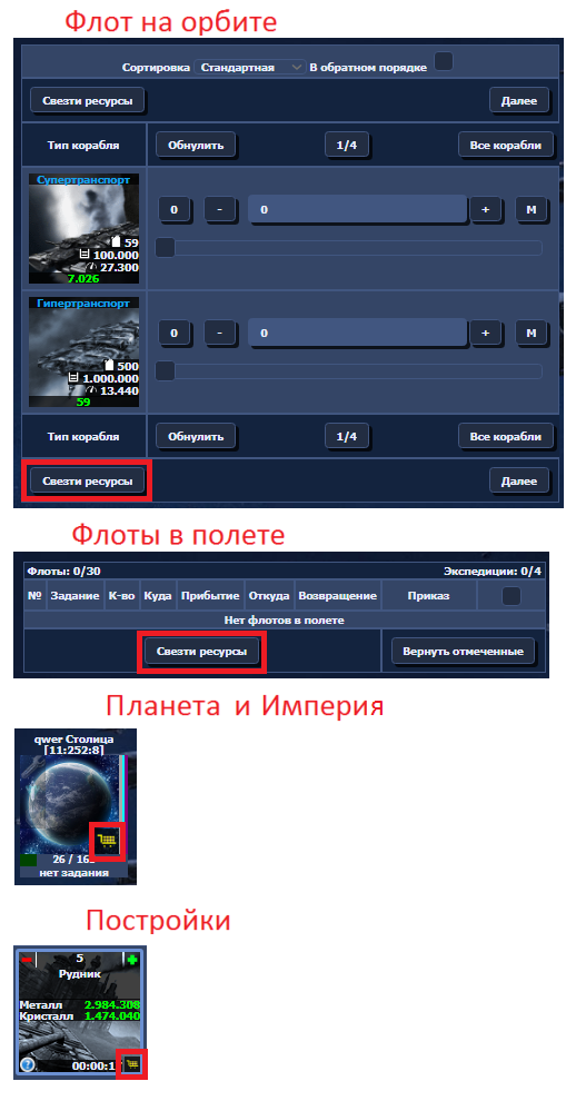 Открыть страницу своза ресурсов можно из списка Флот на орбите, списка Флоты в полете, кликнув на желтой иконке тележки на изображении планеты на страницах "Обзор планеты" и "Обзор Империи", а так же на изображении юнита на странице Постройки. В последнем случае так же будет отображаться количество ресурсов, недостающих для создания данного юнита.