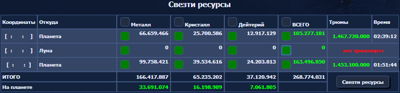Имеется JS-счетчик, показывающий общее количество свозимых ресурсов, как по типу ресурсов, так и по отдельной планете.