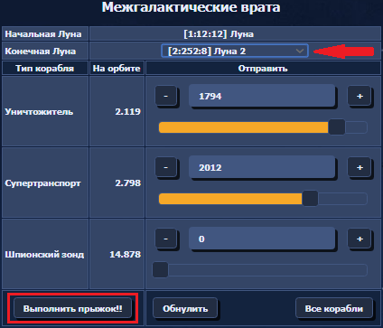 Дальше выбираем Луну, количество флота и нажимаем Выполнить прыжок!!