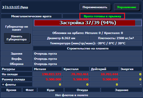 Переброс флота через "Межгалактические врата" можно в Меню "Планеты" (на Луне!) под названием [Управление], будет Межгалактические врата Врата готовы к прыжку. Нажимаем Врата готовы к прыжку.