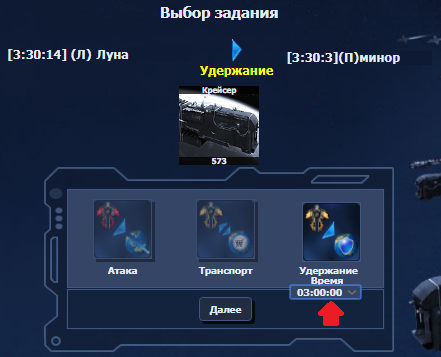 Флот как обычно достигает планеты и показывается с приказом "Удержание". Время, пока флот будет находиться на планете (по умолчанию +1 час, но при старте можно вручную указать и больше срок).