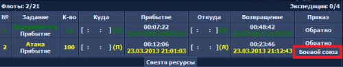 В обзоре все флоты союза показываются в одном блоке. Они летят со скоростью самого медленного корабля (кто отправлял первый флот, все остальные должны отправлять флот на 5-10 мин. быстрее). Союз имеют общее время прибытия. Если в союз вступает новый флот, и он летит медленнее всего союза, то флот не присоединится, и будет писать "Флот слишком медленный и не может присоединиться к боевому союзу"