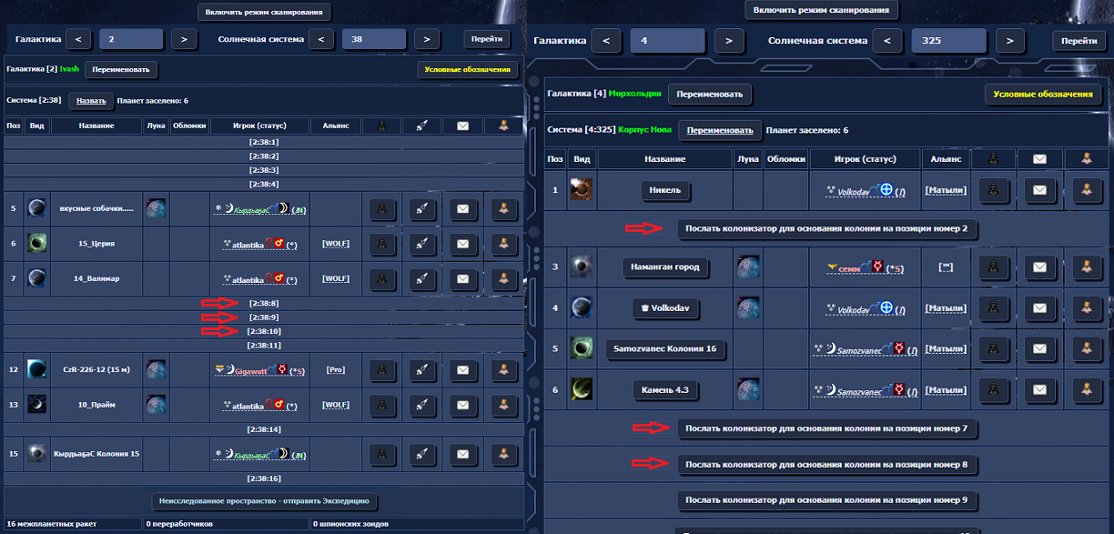 После чего заходим в меню "Обзор Вселенной" и находим пустую планету, где указаны просто "координаты" или как ссылка "Послать колонизатор для колонии на позиции номер ..." (в зависимости от настройки аккаунта)(на рис. ниже).