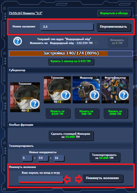 Также в разделе "[Управление]", можно переименовать планету (Невозможно использование служебных символов, и запрещено использование нецензурных слов и оскорблений).